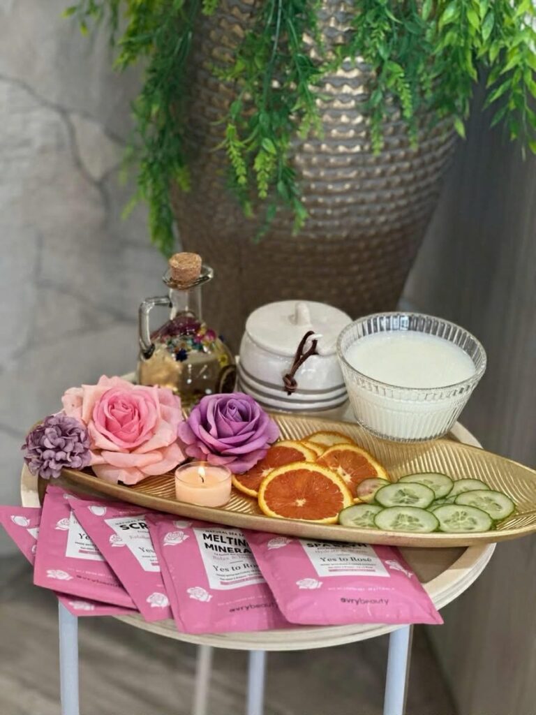 Indulge in a champagne soak with rose petals, followed by a milk and honey citrus scrub that nourishes skin and fights aging by neutralizing free radicals. Enjoy sea salt exfoliation, a collagen mask, and collagen cream, finishing with deeply moisturizing collagen socks.